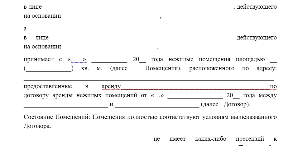 Как и при покупке, реквизиты договора, на основании которого он составляется, указываются в акте приема-передачи помещения в аренду. Если по каким-то причинам арендодатель не передает ключи жильцу при подписании акта, в последнем должны быть отражены временные рамки, в которые будет происходить фактический переезд. В идеале получить ключи и зафиксировать этот факт в документе с учетом их количества и функций: например, «вместе с подписанием документа жильцу выдаются два ключа от входной двери в одном экземпляре, а также один экземпляр ключа от домофона на входной двери подъезда».