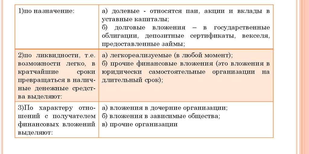 К финансовым вложениям относятся такие виды вложений, которые финансисты называют портфельными: это вложения в капитал других компаний с приобретением ценных бумаг или долговых обязательств, либо это размещение денег на депозитах для получения процентного дохода.