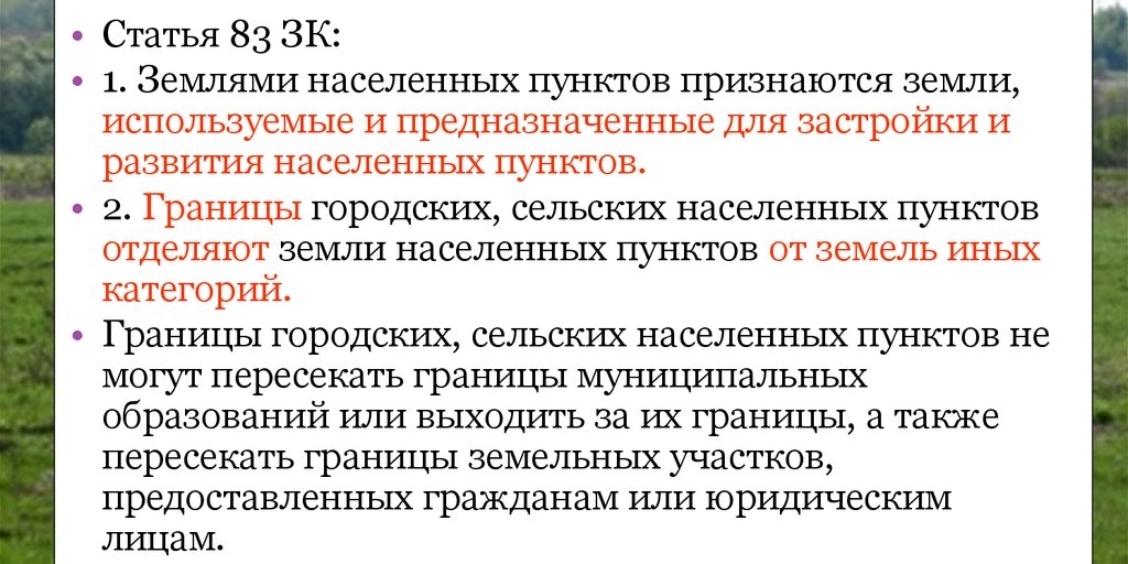 Земельное законодательство выделяет эти земли в отдельную категорию земель. Землями населенных пунктов признаются земли, используемые и предназначенные для строительства и развития населенных пунктов.