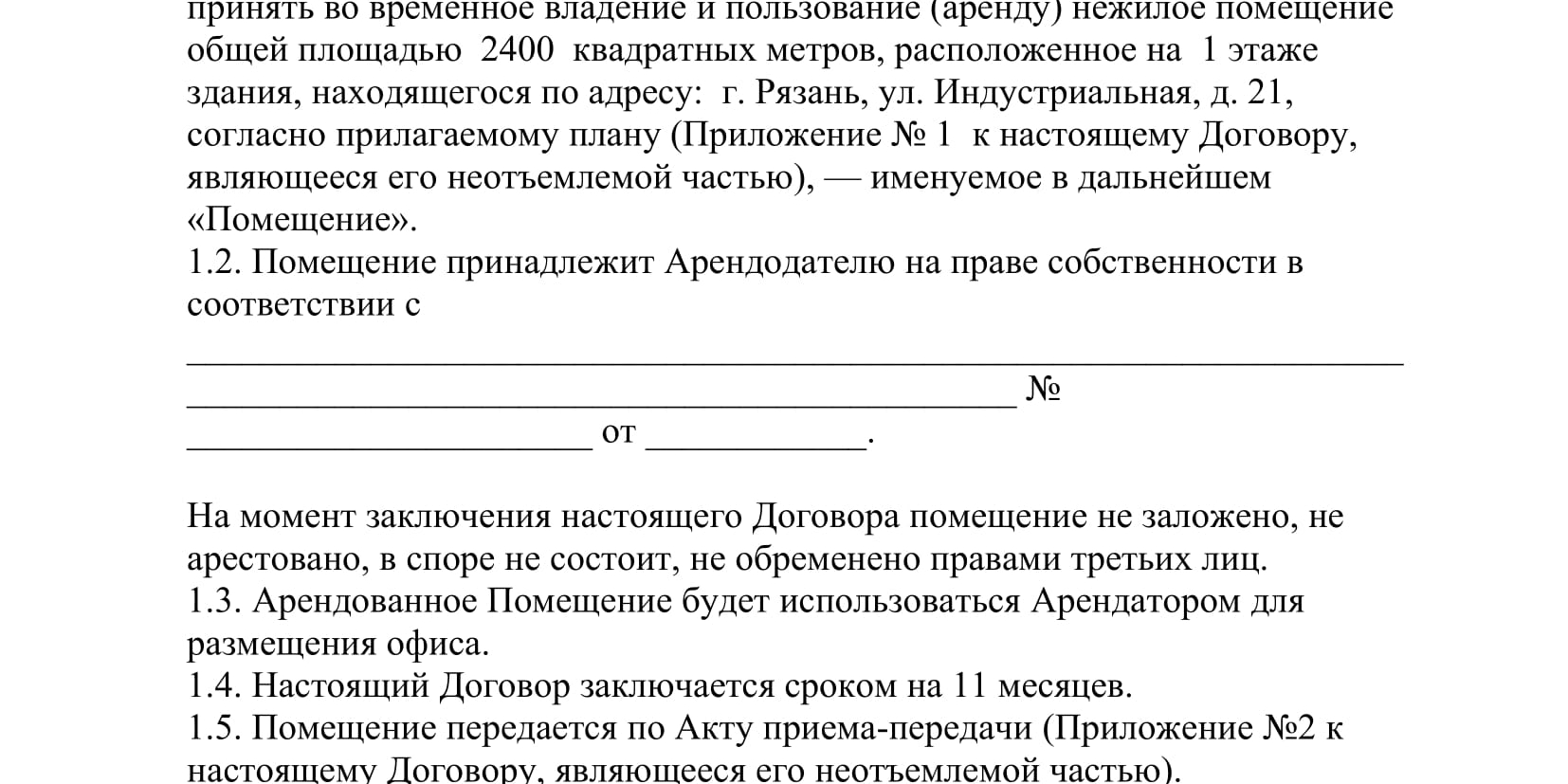 1.5. На момент заключения настоящего Договора сдаваемые в аренду нежилые помещения принадлежат Арендодателю на правах собственности на основании ________________________________________________________________, не находятся в залоге, не арестованы и не являются предметом исковых требований третьих лиц.