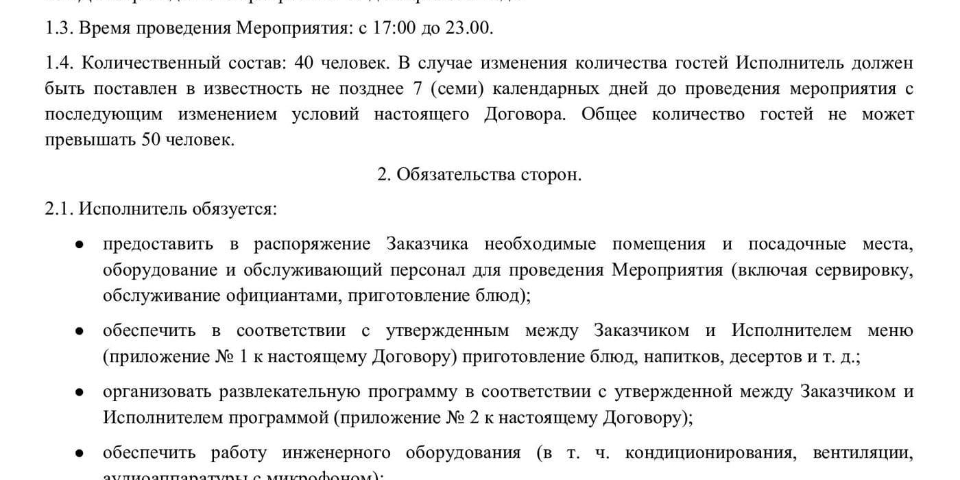 ООО «Общепит», именуемое в дальнейшем «Исполнитель», в лице Генерального директора Кормильцева К.К., действующего на основании Устава, с одной стороны, и ООО «Клубтк.ру», именуемое в дальнейшем «Заказчик», в лице Генеральный директор Воронов А.В., действуя на основании Устава, с другой стороны, заключили настоящий Договор о нижеследующем: 1. Предмет договора. 1.1. Заказчик поручает, а Исполнитель берет на себя ответственность по организации и проведению Новогоднего корпоративного мероприятия (далее – Мероприятие) в ресторане «Праздничный», расположенном по адресу: г. Москва, ул. Первая, д. 1. 1.2. Дата проведения: 27 декабря 2021 г. 1.3. Время проведения Мероприятия: с 17:00 до 23:00. 1.4. Количественный состав: 40 человек. В случае изменения количества гостей, Исполнителя необходимо уведомить об этом не позднее, чем за 7 (семь) календарных дней до начала мероприятия с последующим изменением условий настоящего Договора. Общее количество гостей не может превышать 50 человек. 2. Обязанности сторон. 2.1. Исполнитель обязуется: