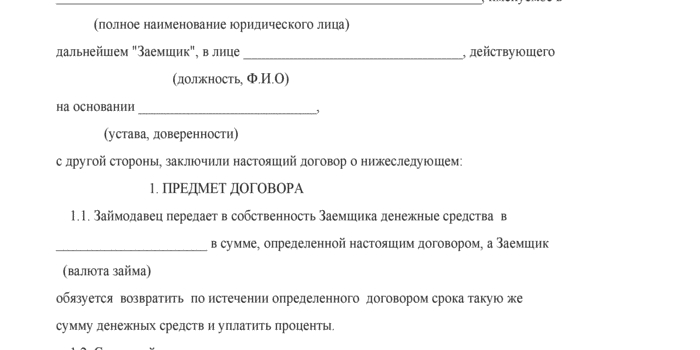 1.1. По настоящему Договору Займодавец передает в собственность Заемщику денежные средства в размере ____________ (далее - Сумма Займа), а Заемщик обязуется возвратить Сумму Займа Займодавцу и уплатить проценты за пользование Займом. Сумма в размере и сроки, указанные в Договоре. Сумма кредита выдается в рублях по курсу ЦБ РФ на день списания денежных средств со счета Займодавца.