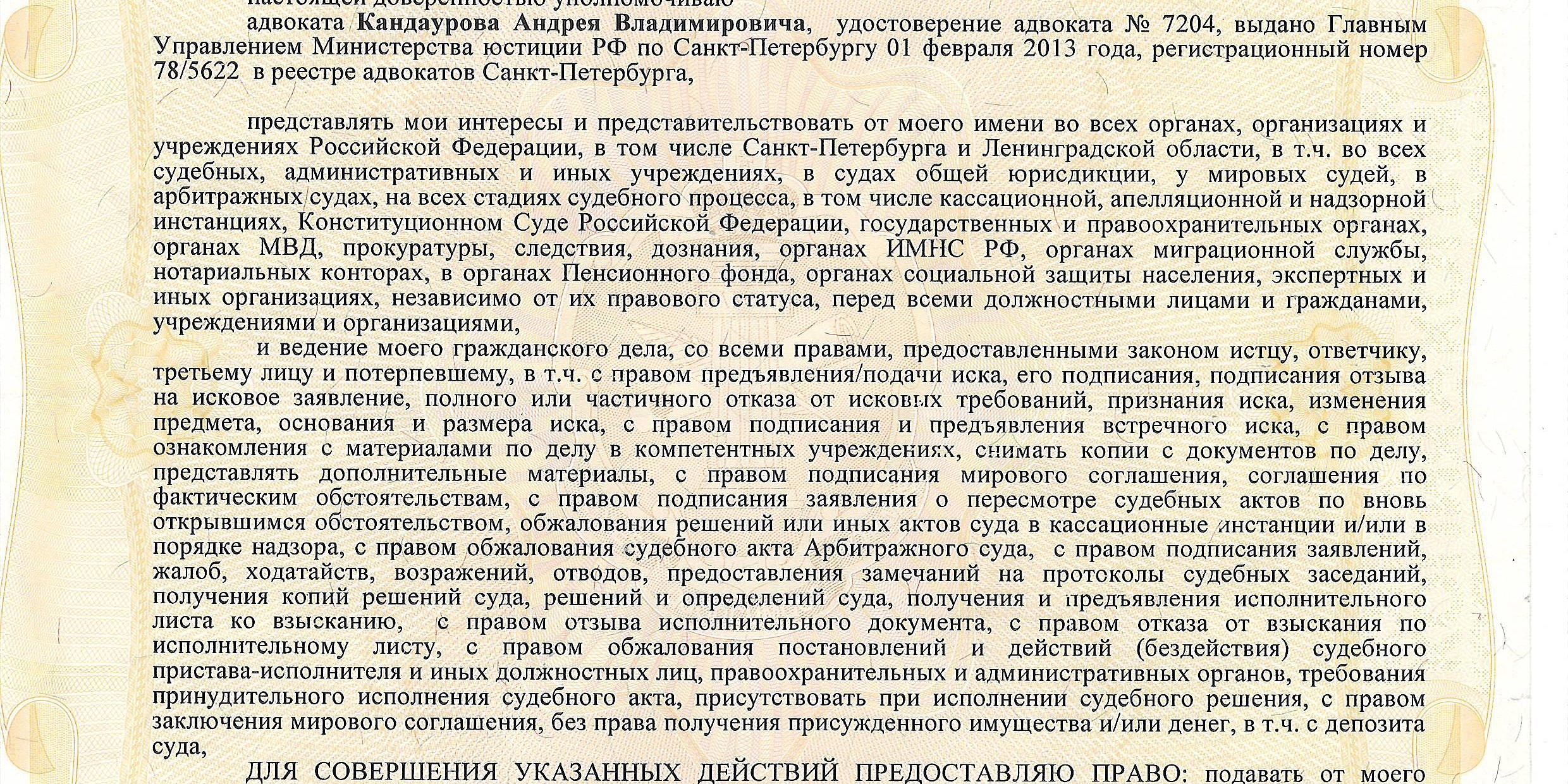 - Отдельно оговорить предоставление следующих прав: подписать исковое заявление, передать спор в арбитражный суд, отказаться от исковых требований (полностью или частично), обжаловать исполнительный лист на взыскание, получить присужденное имущество или денежные средства. Необходимость указания на эти нюансы предусмотрена ГПК РФ.
