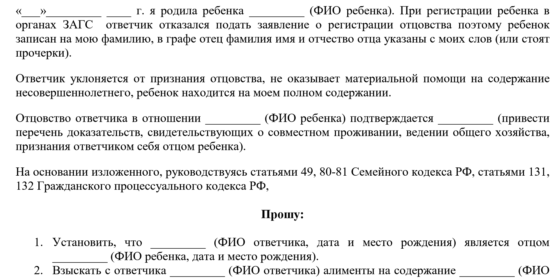 Если недобросовестный родитель категорически отказывается признавать отцовство, необходимо установить этот факт через суд (ст. 49 СК РФ). Для этого вам необходимо подать иск в суд, в котором просите установить факт отцовства (подается по адресу места жительства ответчика), одновременно можно требовать взыскания алиментов (можно подать как по адресу адрес ответчика и истца). К заявлению приложить документ, подтверждающий уплату государственной пошлины в размере 300 рублей, документы о рождении ребенка, письменное свидетельство об отцовстве ответчика.