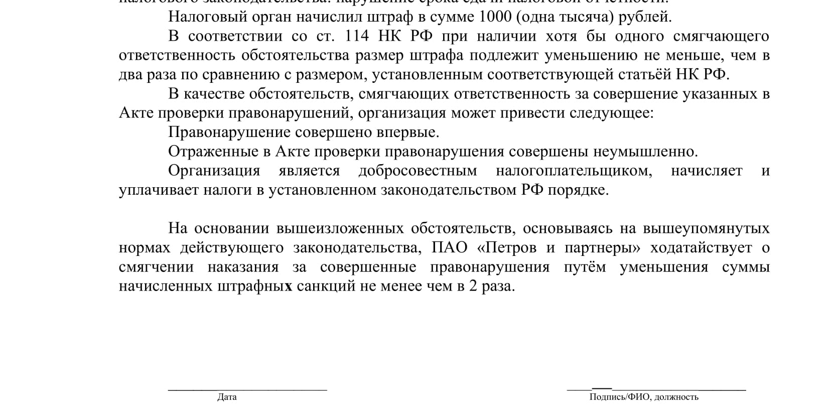 Пример как написать заявление в налоговую о снижении штрафа