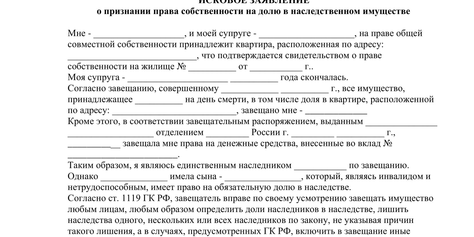 Исковое заявление о признании права собственности на земельный участок подается в случае отказа Росреестра в регистрации в упрощенном порядке права собственности на земельный участок, предоставленного до 30 октября 2001 года.