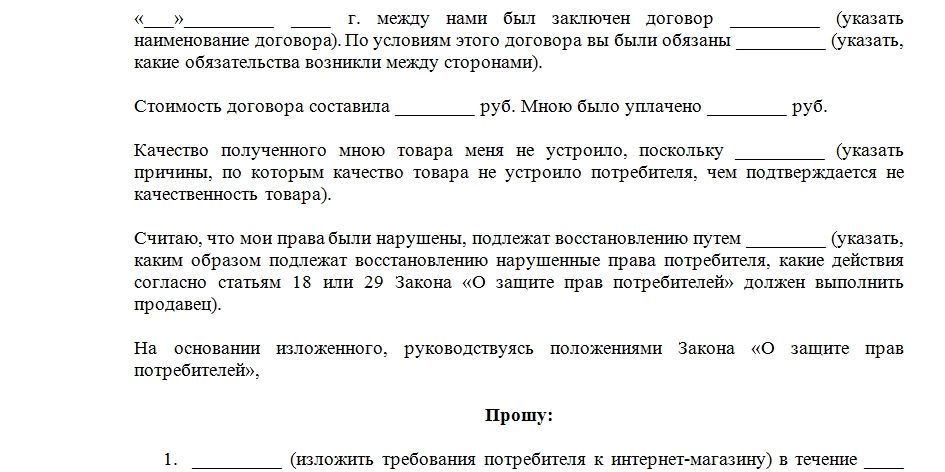 - Требования к магазину, например, вернуть деньги за бракованный товар или обменять его на идентичный товар;