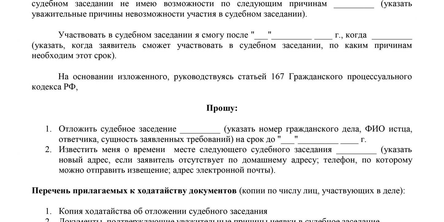 В частности, в целях персонализации работы сайта мы обрабатываем IP-адрес региона вашего местонахождения. При наличии этих причин суд почти всегда откладывает рассмотрение дела. Однако следует иметь в виду, что перечисленные причины не являются бесспорными основаниями для отложения. Суд может, заслушав мнение сторон и убедившись, что наличие таких оснований не препятствует объективному рассмотрению дела в данном судебном заседании, принять решение о продолжении судебного разбирательства.