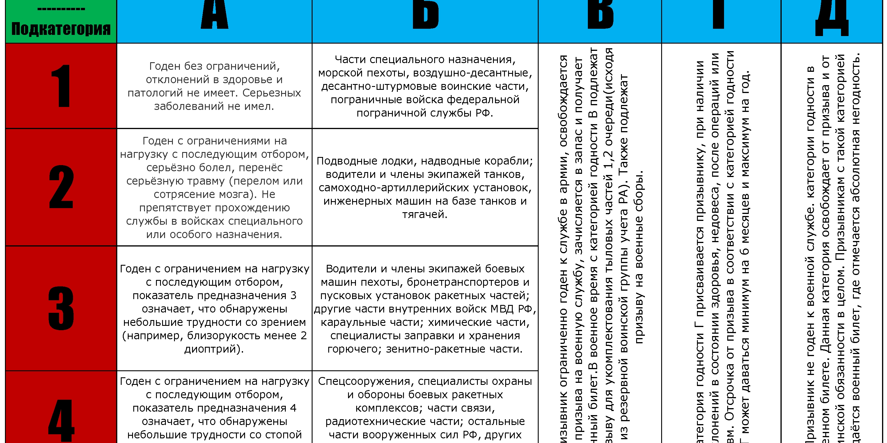 - "Д" - не годен, полностью освобожден от воинской обязанности.