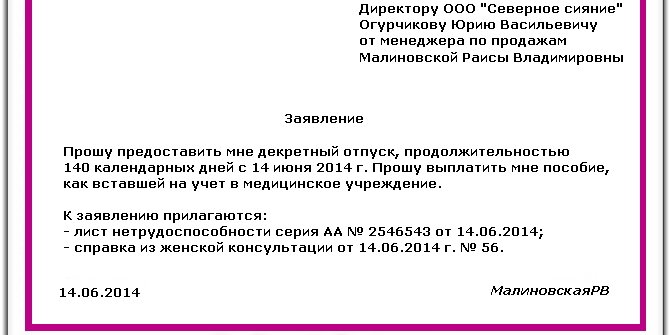 - В любое время роженица имеет право приступить к работе, даже если впереди еще отпуск. Для этого достаточно прийти к работодателю и написать заявление. Нельзя обращаться с требованием предоставить работу. Но на практике лучше сделать все письменно.
