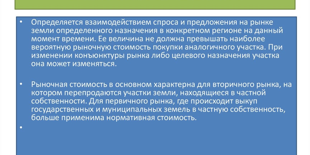 - Кадастровая стоимость устанавливается органами исполнительной власти муниципального района, в котором он расположен (а не оценщиками или лично, как в рыночном районе). При этом не учитывается, относится ли земля к сельскохозяйственным целям или будет использоваться для строительства какого-либо объекта;