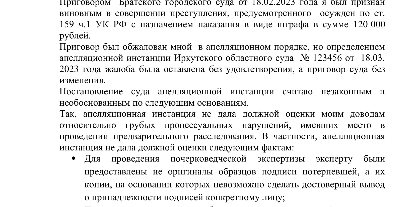 Адвокат по уголовным делам Правого центра «Человек и Закон» готов изучить Ваше дело, решение по нему, вынесенное Апелляционным судом, и помочь написать кассационную жалобу. Для того, чтобы адвокат по уголовным делам мог приступить к своей работе, просим вас предоставлять полную информацию о ходе судебного разбирательства, не скрывая никаких обстоятельств дела.