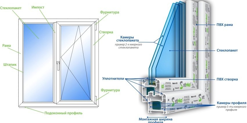 Металлопластиковое окно имеет стандартную общую конструкцию: