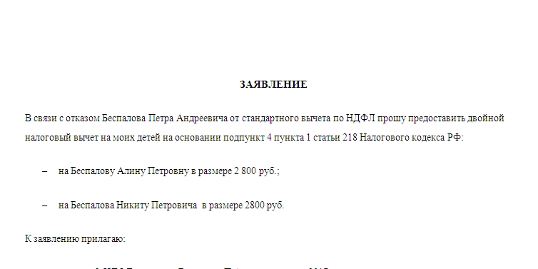 Написать заявление на получение стандартного налогового кредита на детей (детей) работодателю.