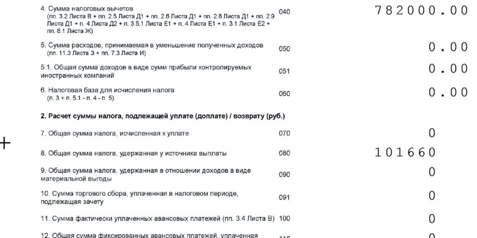 Пример листа Д1 с расчетом имущественного налогового вычета. В нем указывается общая сумма причитающегося имущественного вычета, сумма полученного вычета и остаток. Отдельно указаны расчетные суммы вычета за покупку и проценты по ипотеке.