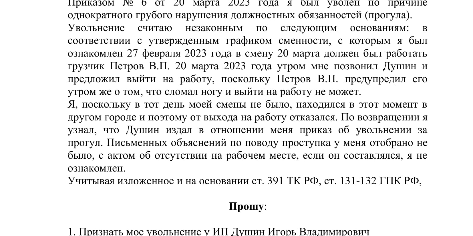 Если претензионное письмо о незаконном увольнении, направленное в трудовую инспекцию, а затем в прокуратуру, не сработало и уволенный работник не был восстановлен на работе, следует обращаться в суд. Особое внимание следует обратить на обоснованность претензии, в которой должны быть отражены противоречащие нормам трудового законодательства действия работодателя в части основания и порядка увольнения. В иске заявитель должен просить суд обязать работодателя: