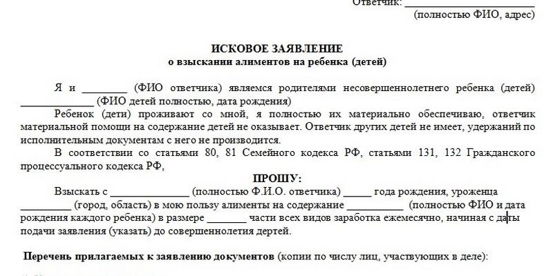 | Текст документа | • Дата заключения брачных уз. • Год рождения и Ф. И. О. иждивенца. • Причины обращения в суд. • Ссылки на нормативные акты, подтверждающие правомерность поданного искового заявления. |
