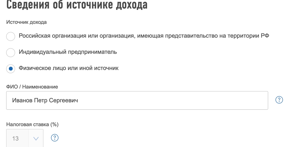 - Перейти в раздел «доходы, полученные в РФ», нажать «плюс» в графе «источник выплат»;