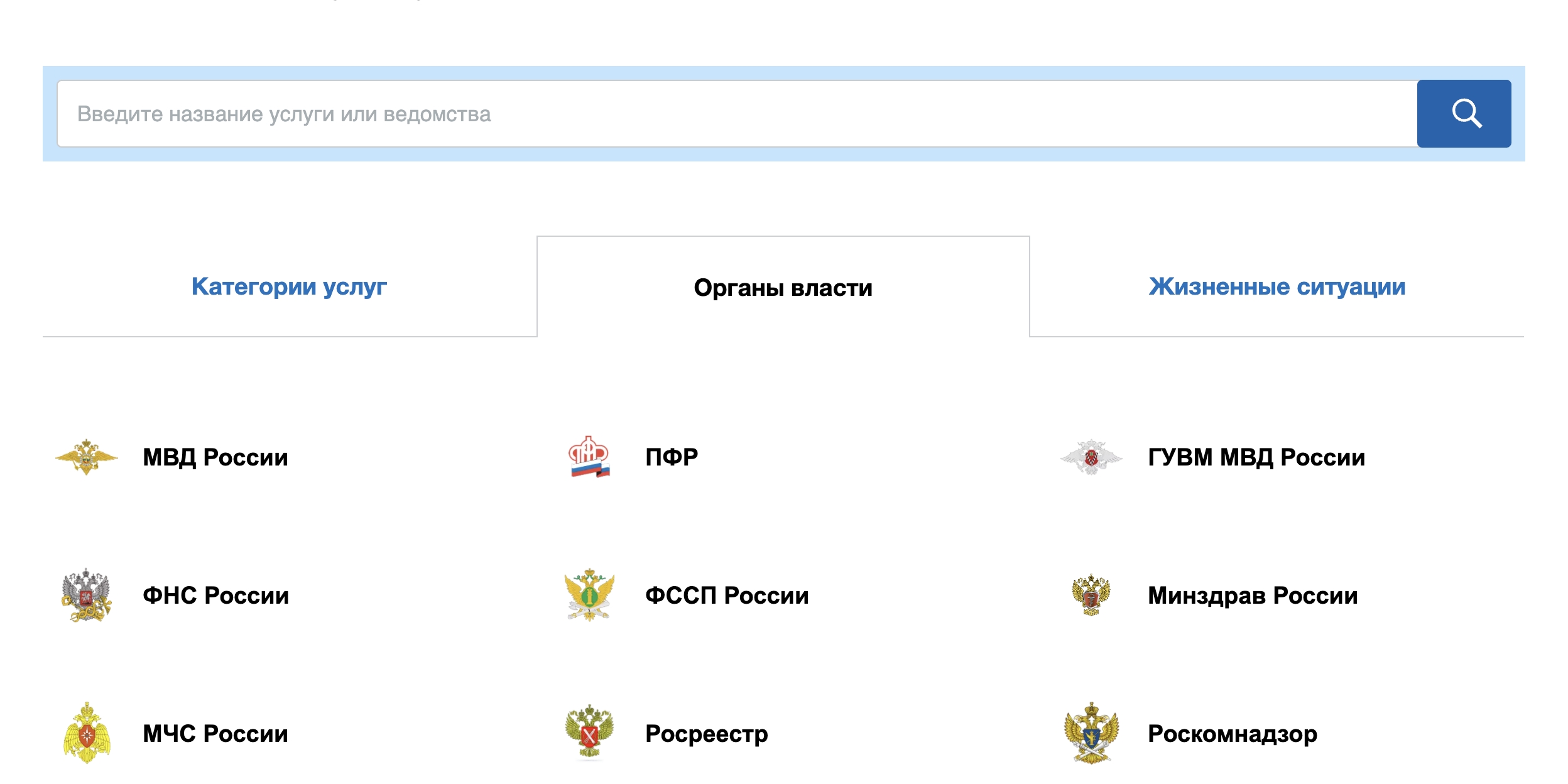 - Открыв вкладку «Органы власти», найдите «ФССП России» и «Судебный долг».