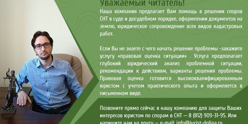 Тем не менее, Андрей Петрович, как и планировал, продал свою землю. Новым владельцем сайта стал Юрий Яковлевич, бывший сотрудник прокуратуры Иркутской области. Решив заключить с товариществом договор об использовании общего имущества товарищества, мужчина столкнулся с неожиданным отказом председателя СНТ заключить этот договор. Как человек, знающий букву закона не понаслышке, Юрий Яковлевич составил исковое заявление о понуждении председателя СНТ заключить договор. Суд безоговорочно встал на сторону заявителя, указав на недобросовестность действий председателя. После этого прецедента другие участники СНТ инициировали общее собрание, на котором новым председателем дачного товарищества был избран Юрий Яковлевич.