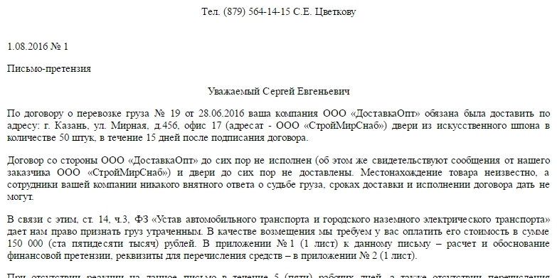 Этот вариант претензионного письма популярен при разрешении конфликтов, как между физическими лицами, так и между юридически обязанными сторонами. После того, как вышеперечисленные пункты будут правильно оформлены и заполнены, нужно отправить образец претензии в магазин или любую другую организацию, которая не соблюдает условия договора.
