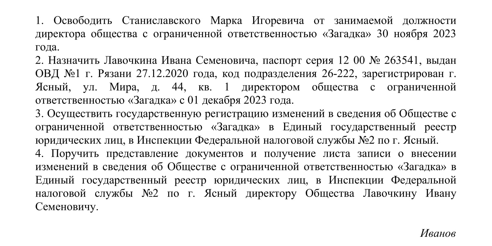 - Принятие решения о замещении руководителя на основании устава организации. Подготовка документального подтверждения: протокола или решения.