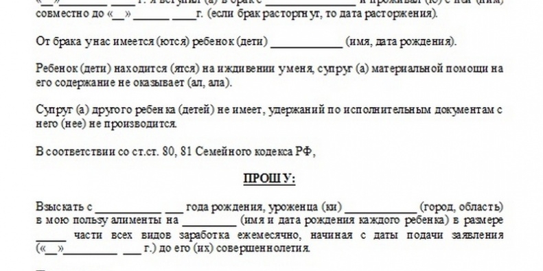 При необходимости используйте следующий вид образца для составления заявления о взыскании денежных средств на содержание ребенка.