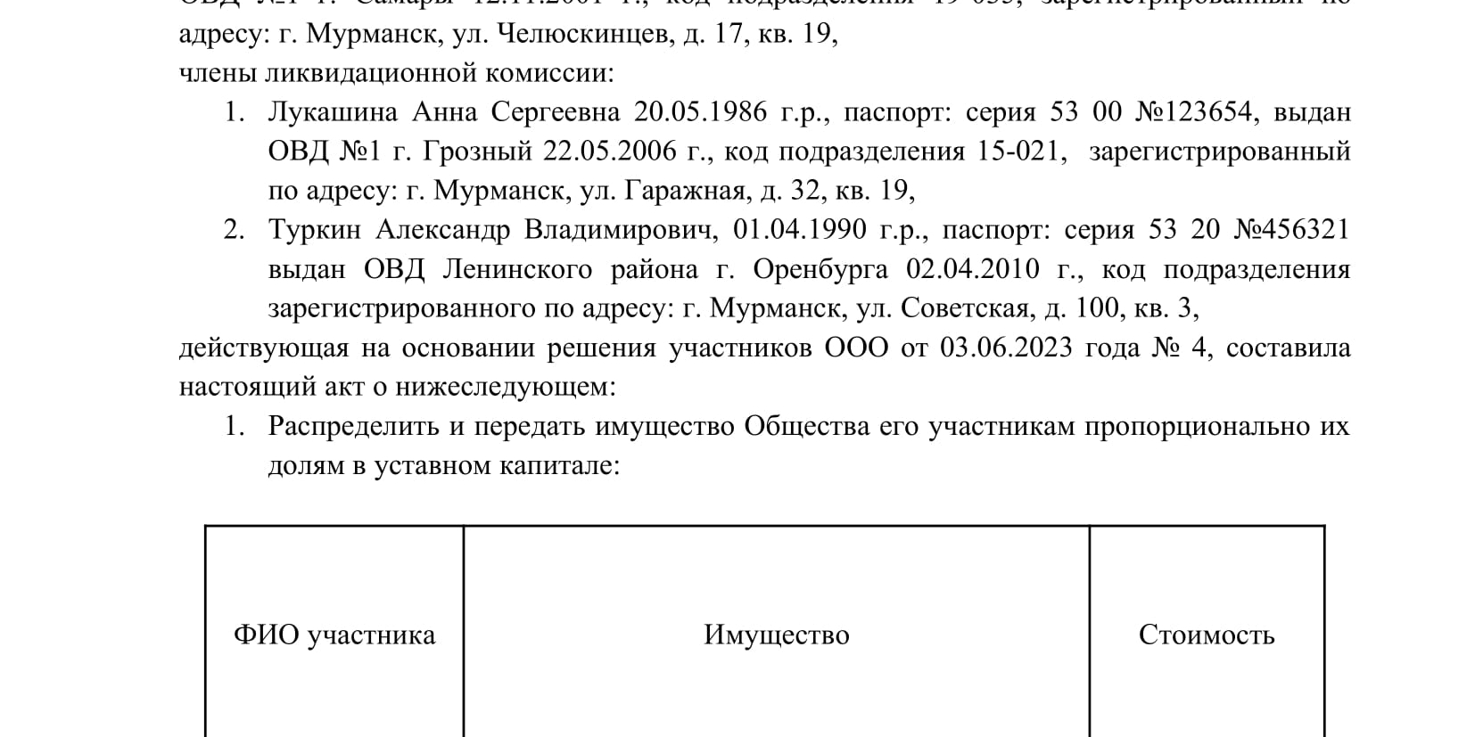 Если после выплаты прибыли осталось нераспределенное имущество, оно подлежит передаче участникам на основании передаточного акта, который подписывается с одной стороны председателем ликвидационной комиссии, с другой стороны, участником ООО (или всеми участниками, если их несколько).