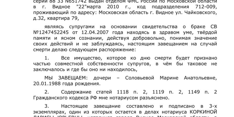 Супруги должны точно указать информацию о недвижимости или движимом имуществе. В завещании может быть указан душеприказчик, который может быть назначен обоими супругами или каждым из них. Открытое письменное волеизъявление может быть составлено без свидетелей. Достаточно нотариально заверить и оплатить соответствующие расходы.