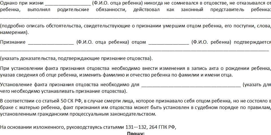 В отдельных случаях (смерть матери, ее отсутствие или признание ее недееспособной) заявление о признании факта отцовства может подать только отец. Кроме того, при признании факта отцовства вместе с заявлением необходимо предоставить документ органа опеки и попечительства, дающий согласие на установление отцовства.