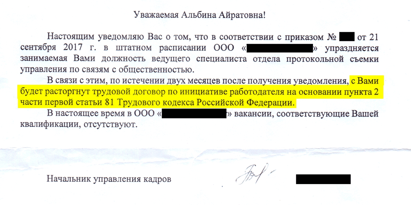 Если начальник может предложить вам другую работу, то это также должно быть указано в письме. При этом он обязан уведомлять вас о новых вакансиях до самого увольнения (2 месяца ), и решать вам, уйти с высоко поднятой головой или согласиться обменять родной офисный стол на пыльную кладовку на складе; Профсоюз (если есть) и органы занятости уведомлены о предстоящих изменениях в организация за 2 месяца официальным письмом.Если речь идет о массовом сокращении, то это должно быть сделано за 3 месяца, не член ее рядов; - Учет прав работников остаться на работе. Если работодателю, скрепя сердце, приходится выбирать из нескольких кандидатов, кто будет уволен по сокращению и получать необходимые выплаты, то ему придется считаться с такими юридическими «неприятностями». Нельзя по этой статье увольнять молодую маму (с ребенком до трех лет) или будущую маму (беременность подтверждается справкой от врача). Эх, помните, как долго не могли решиться на вторую ребенок? Вот и все! Предпочтение следует отдавать специалисту с более высокой квалификацией или производительностью труда. Все-таки не зря вы просидели штаны на семинаре по компьютерной программе 1С. Если с производительностью и квалификацией все в порядке с производительностью и квалификацией всех сотрудников, которым грозит увольнение и выходное пособие, то остается «живым»: Те, кто содержит двух и более человек. ее как иждивенца? Те, в семье которых никто, кроме них, больше не получает официального дохода. Работодателю вовсе не обязательно знать, что ваш муж — востребованный внештатный IT-специалист, который хотел начихать на трудовую книжку и официальную регистрацию. гарантия обеспеченной старости – внушительная сумма на банковском депозите; Те, кому «посчастливилось», работая «на дядю», получить травму или получить профессиональное заболевание. Иногда даже бизнес имеет человеческое лицо; Тем, кто воевал в ВОВ или участвовал в боевых действиях. Вашему начальнику будет мало рассказов о вашем героическом прошлом, поэтому слова придется подкрепить документами (например, удостоверением участника боевых действий); Те, кого дорогой начальник отправлял повышать квалификацию на работе. При этом его не интересовало, как вы успеваете учиться, работать, общаться с детьми и навещать пожилых родителей, если в сутках всего 24 часа .
