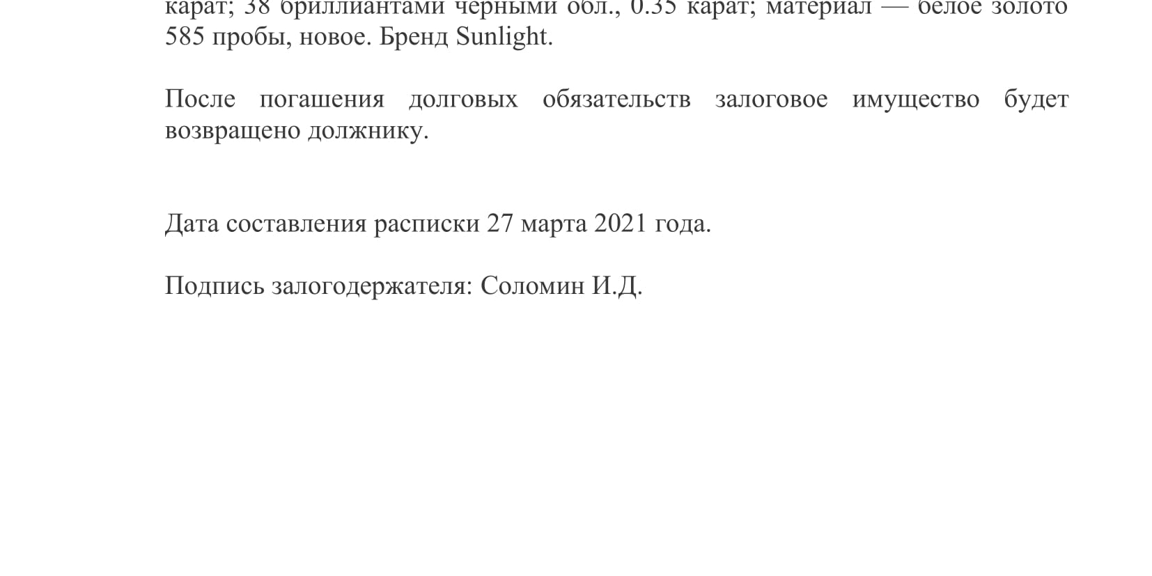 В случаях, когда юридические или физические лица составляют договор займа, а залог в подтверждение его условий вносится кредитуемым лицом, законность такой сделки обеспечивается написанием соответствующего документа - залоговой расписки.