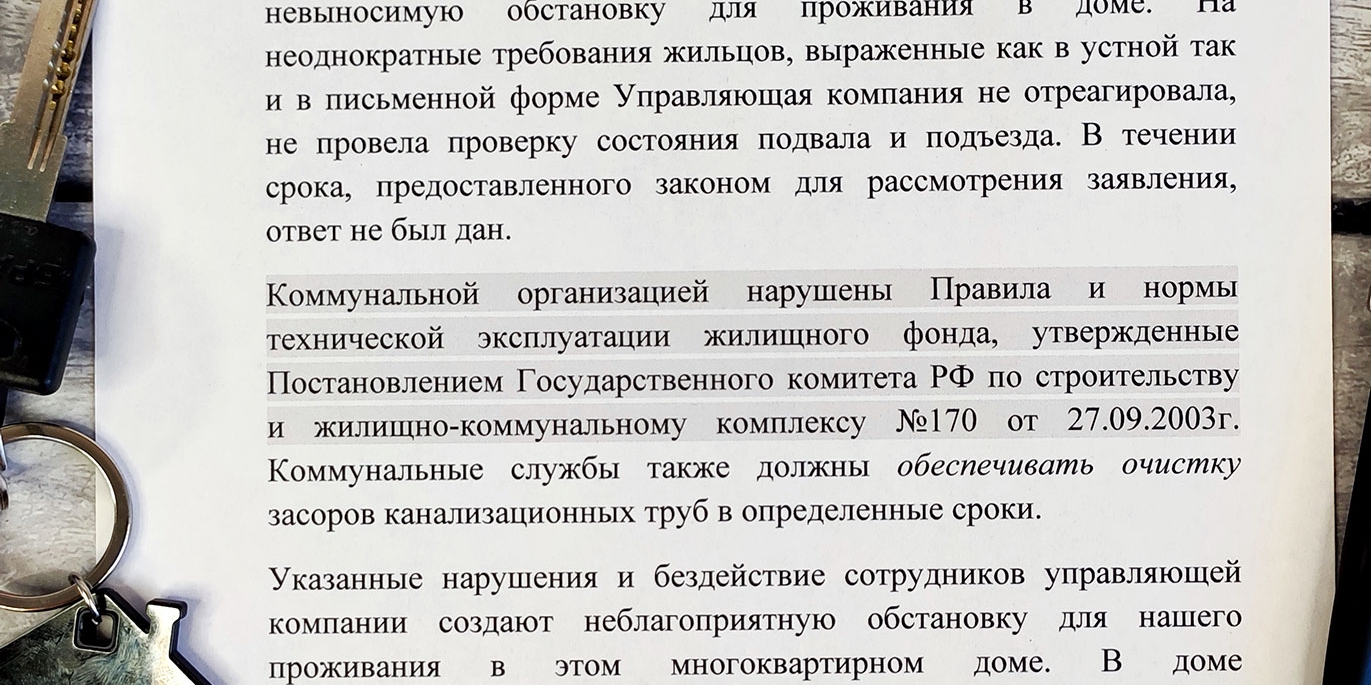 Образец текста: «Из подвала жилого дома № 35 по ул. Интернациональной слышен неприятный запах канализации. Подвал не используется жильцами дома в личных целях. Обращение в управляющую компанию в устной и письменной форме было проигнорировано и не повлекло решения проблемы. Просим Вас провести санитарно-эпидемиологическое обследование подвала для выявления причины зловония и принятия управляющей компанией решения об устранении выявленных неисправностей. Просим письменно уведомить нас о результатах проведенной работы в сроки, установленные законодательством».