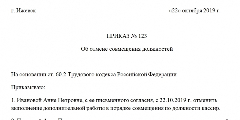 Стоит помнить, что сам факт отмены совмещения нескольких вакансий не отображается в трудовом документе, который выдается работнику. Приказ и уведомление работника по образцу и унифицированной форме о доплате должны содержать: