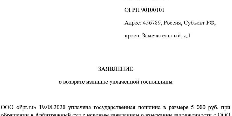 | В Федеральной налоговой службе Российской Федерации субъекта Российской Федерации От Общества с Ограниченной Ответственностью Ppt.ru ИНН 1234567890 ОГРН 90100101 Адрес: 456789, Россия, Субъект РФ, г. Пр. Замечательный, д. 1 УТВЕРЖДЕНИЕ О возврате госпошлины 19 августа 2020 года ООО «ППТ.ру» уплатило государственную пошлину в размере 4 000 рублей. при обращении в Арбитражный суд с иском о взыскании задолженности с ООО «ННН». Иск был принят судом, возбуждено гражданское дело № 123. 30 августа 2020 года производство по делу № 123 прекращено. Госпошлина подлежит возврату, так как производство по делу прекращено, что является основанием для возврата денежных средств по п. 3 ч. 1 ст. 333.40 НК РФ. На основании изложенного, руководствуясь статьей 333.40 НК РФ, Я мешок: Возврат госпошлины в размере 4000 руб. Список прилагаемых документов: