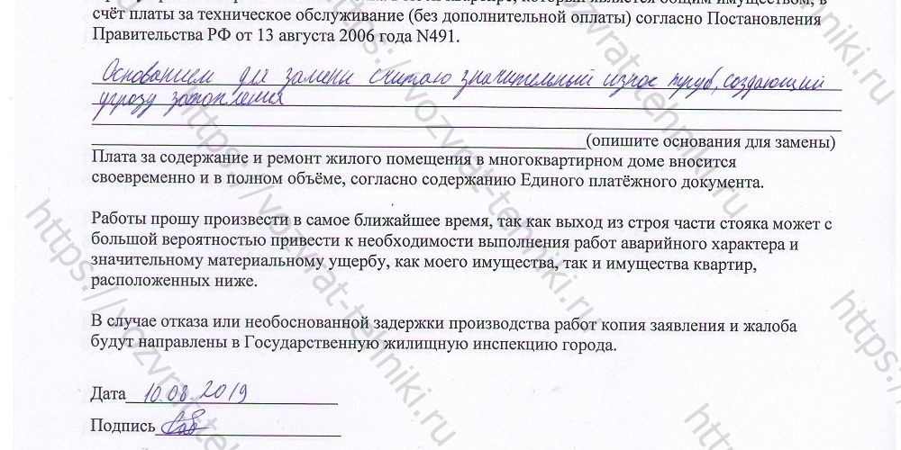 Заявление на замену стояка в квартире