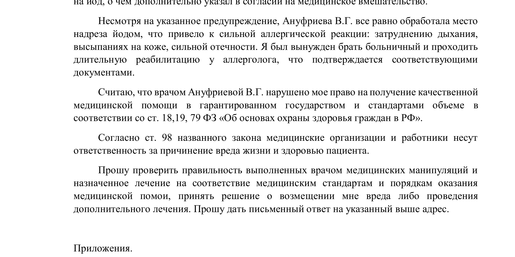 - Описание ситуации. Указываются дата, время, место происшествия, данные врача, его поведение. Обязательно отметьте, какие права были нарушены.