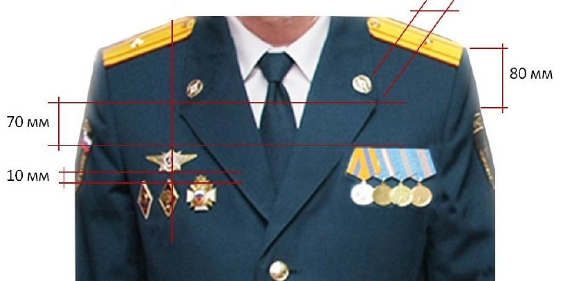 - Верхняя граница первого ряда медалей старшего состава расположена на расстоянии 70 мм ниже линии уступа лацкана, у остальных сотрудников правоохранительных органов - на 20 мм ниже.